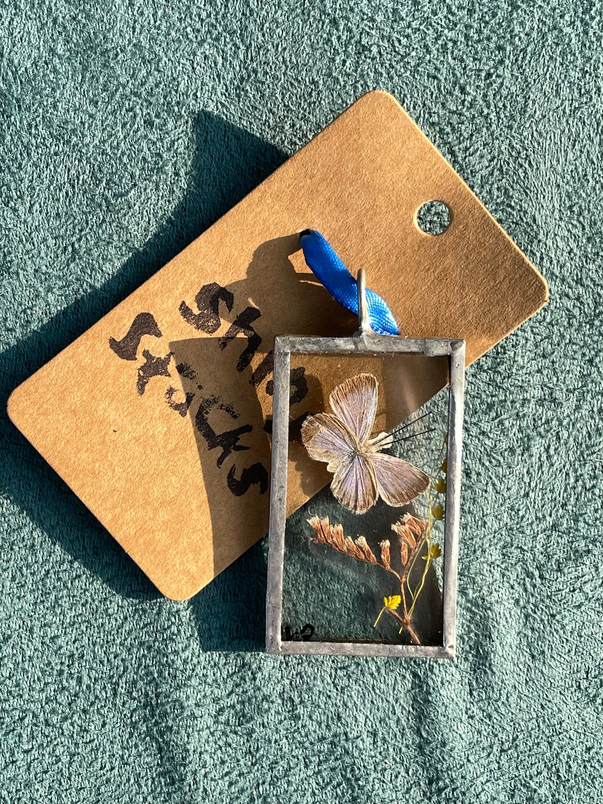 The focus of this pendant are the pressed and dried flowers that the artist used to make the beautiful and creative butterfly landscape. You can see the care that went into this piece and we care just as much about getting it to a loving home 🥰