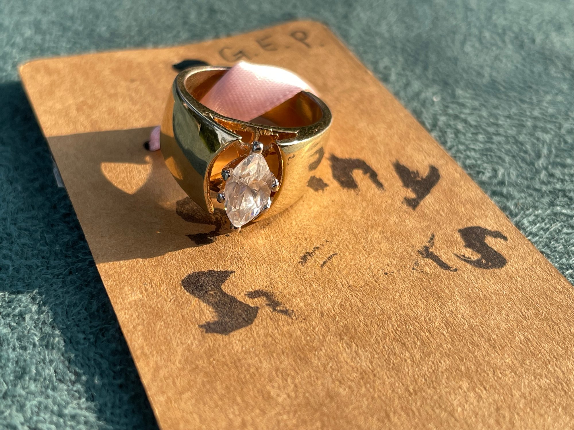 This ring is 18kt gold electroplated, so it is a great sustainable and accessible option for looking super fancy on a budget. The marquis cut stone in the center is suspected glass
