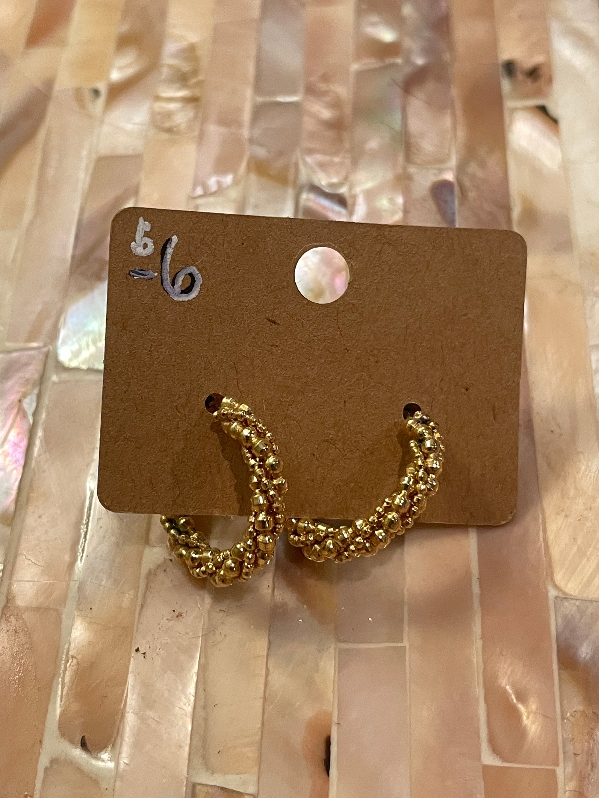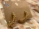These goldtone smaller hoop stud earrings are covered in what look like little baby bubbles. They wrap around the hoops to give them a unique textured look.