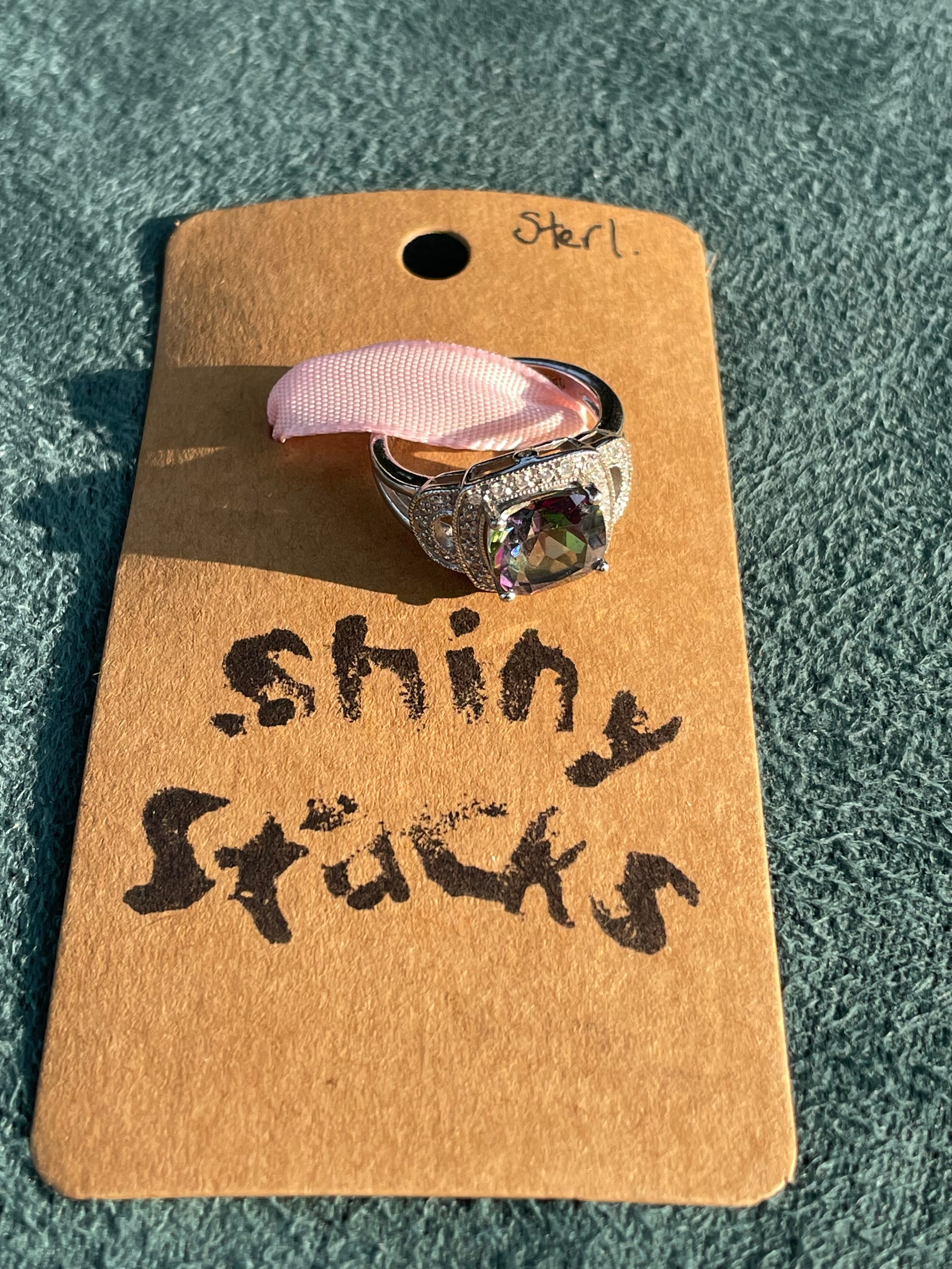 This sterling silver ring is a size 6 with a mystic topaz as the focal point, transporting you to another universe. Protected by the colony of cubic zirconias, this incredible stone is a mystical, majestic, and magical piece to add to any collection✨