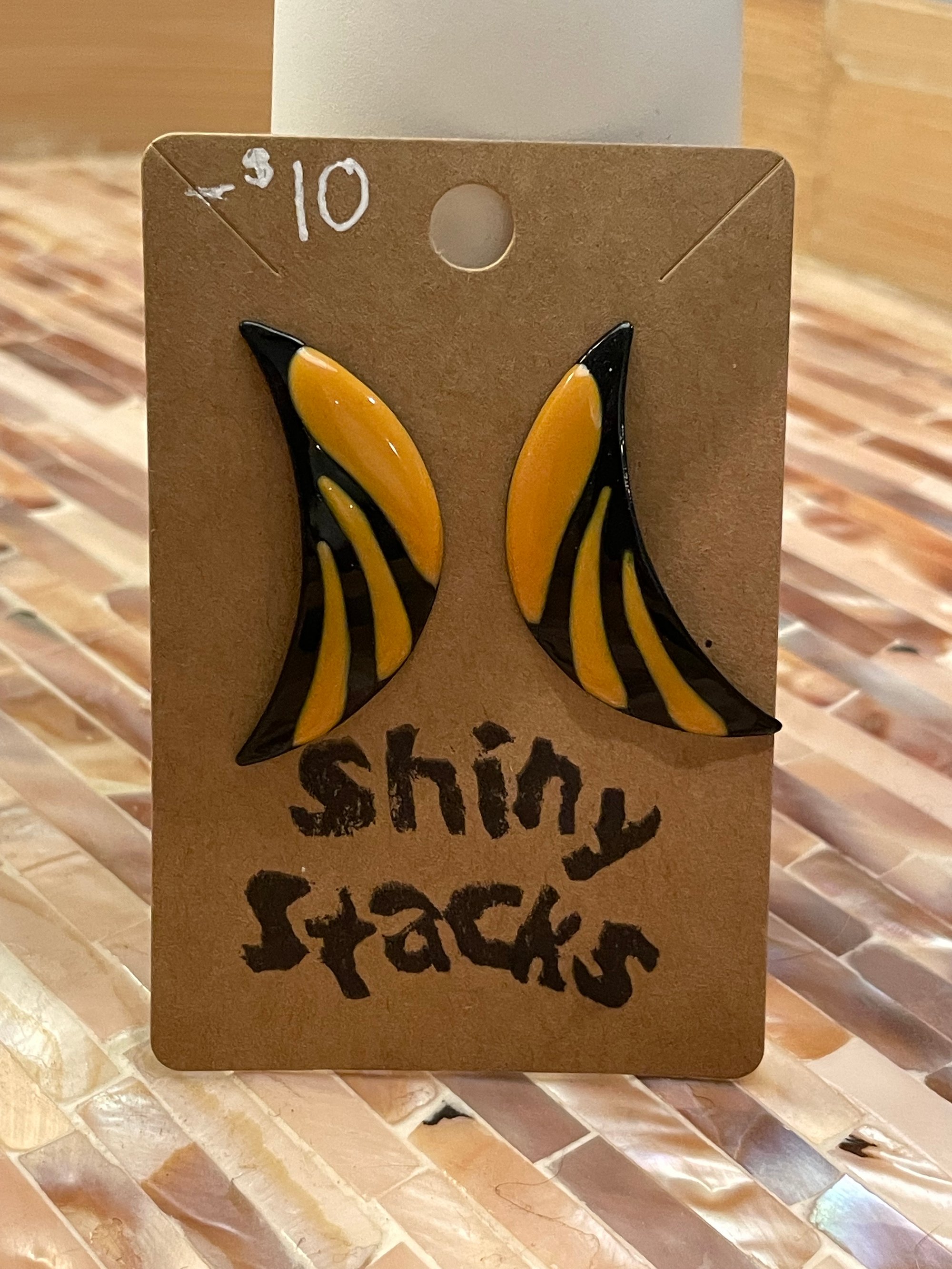 These earrings are definitely a statement with their striking yellow and black crescent design. The metal they are made of is unknown, so these are a steal in our costume section.