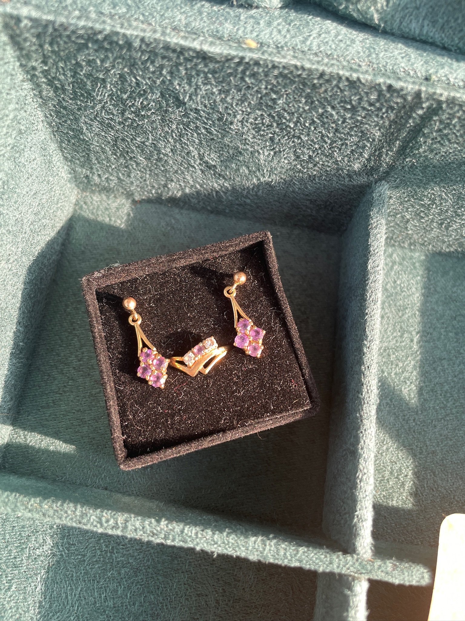 A matching vintage set of 9k amethyst dangle drop earrings and matching 9k two-tone gold amethyst and cubic zirconia ring suspected to be from the 90s. I'm not sure if this set stayed together all this time or came together later, but I love imagining its story. I wonder who will write the next chapter? 🥰