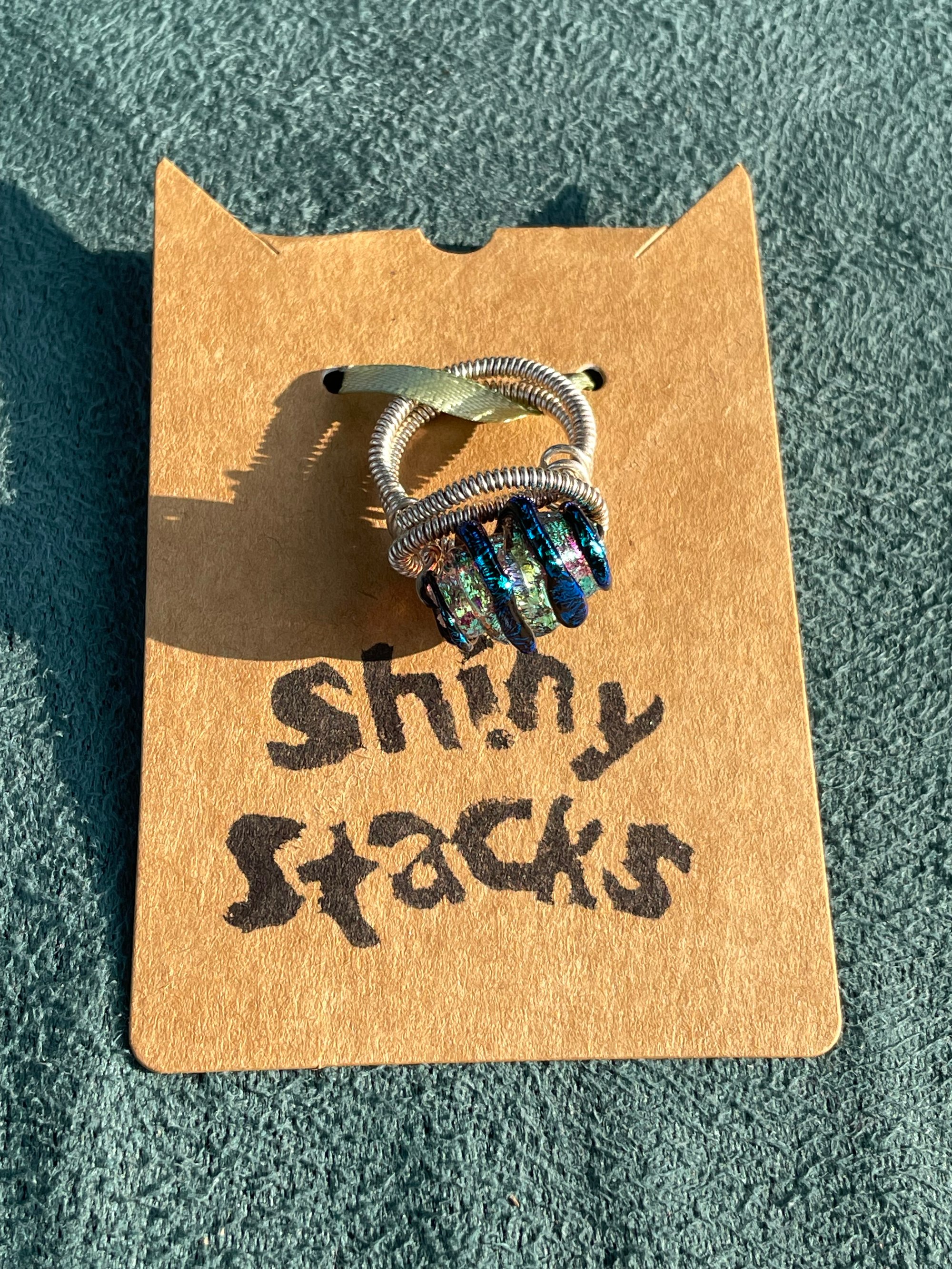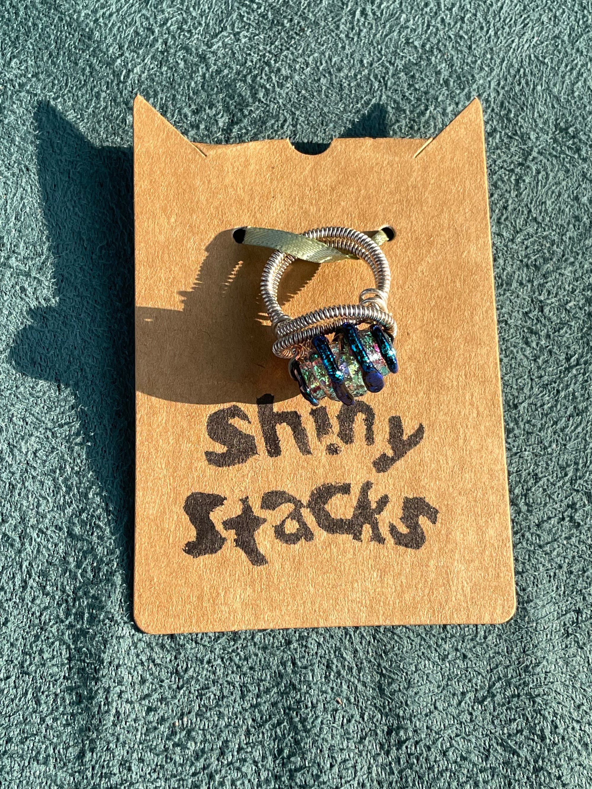 This Trina Turk ring is very steampunk but add more futuristic sci-fi and a hint of fantasy. The band itself resembles a coil and is suspected to be sterling silver, however not confirmed. There is also a blue aura coated stone that wraps in a more wire-like way around it. This ring awakens the nerd in us.